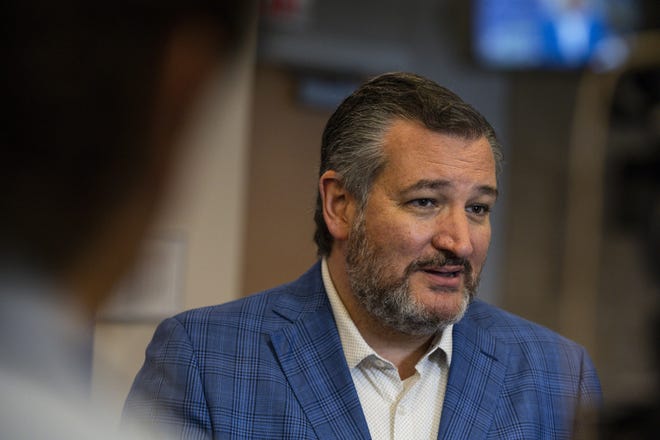 Senator Ted Cruz (R-Texas) speaks at a news conference, hosted by the Midland-Odessa Transportation Alliance, about the recent amendment to the National Infrastructure bill by himself and Senator Ralph Warnock (D-GA) to add a new leg of I-14 into Texas, Thursday, Sept. 2, 2021 in Midland, Texas. The amendment, which is part of a $1 trillion bipartisan infrastructure proposal, was adopted by a unanimous voice vote of the United States Senate. (Eli Hartman/Odessa American via AP)